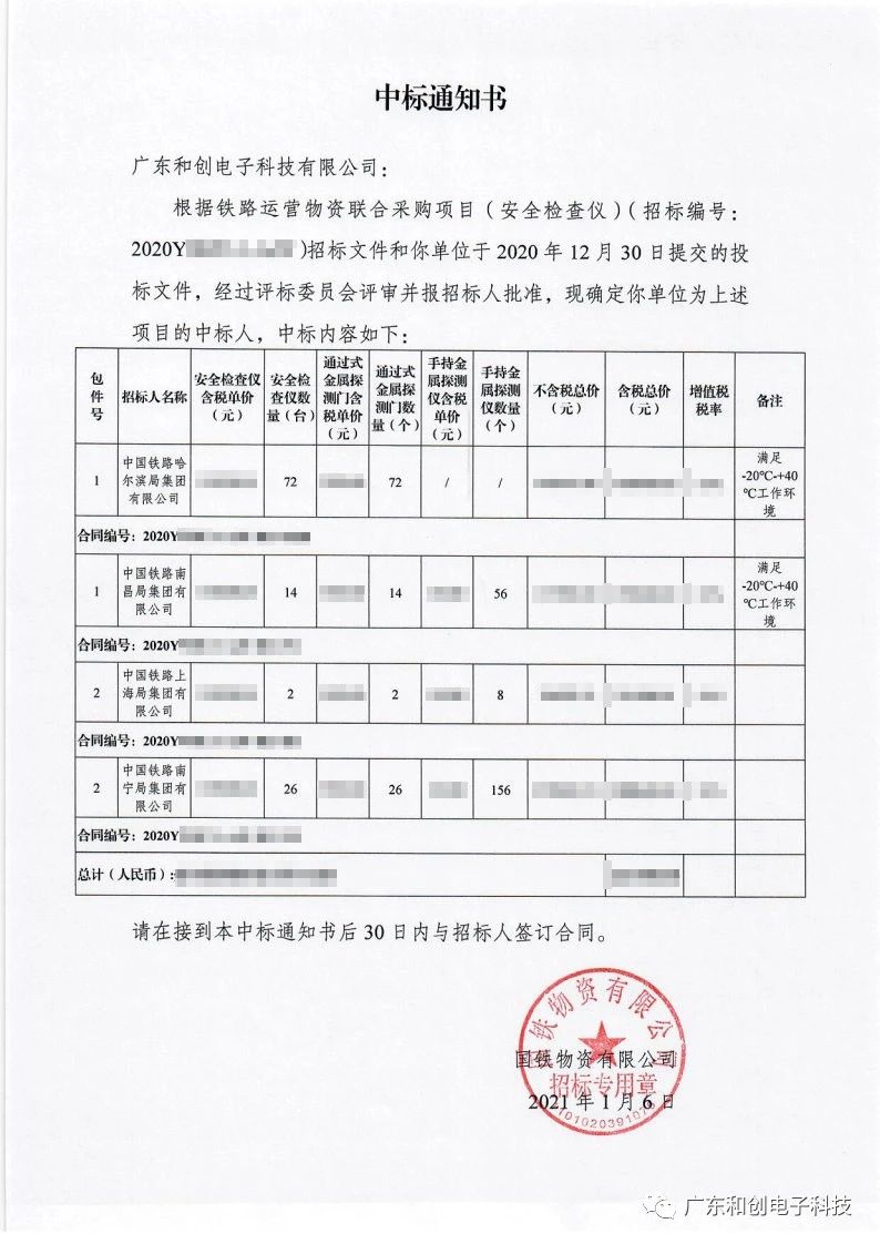 China National Railway Group Corporation, public bidding for railway safety inspection equipment, after fierce competition, Guangdong Hechuang Electronic Technology Co., LTD won the bidding of this procurement project with good product quality and excellent service quality. Bid for security inspection equipment, including: "X-ray baggage screening machine, metal detection door, hand-held metal detector". For some time to come, He Chuang electronics will need to provide all the safety inspection equipment mentioned in the letter of acceptance to the four railway bureaus of China Railway Harbin, Nanchang, Shanghai and Nanning.